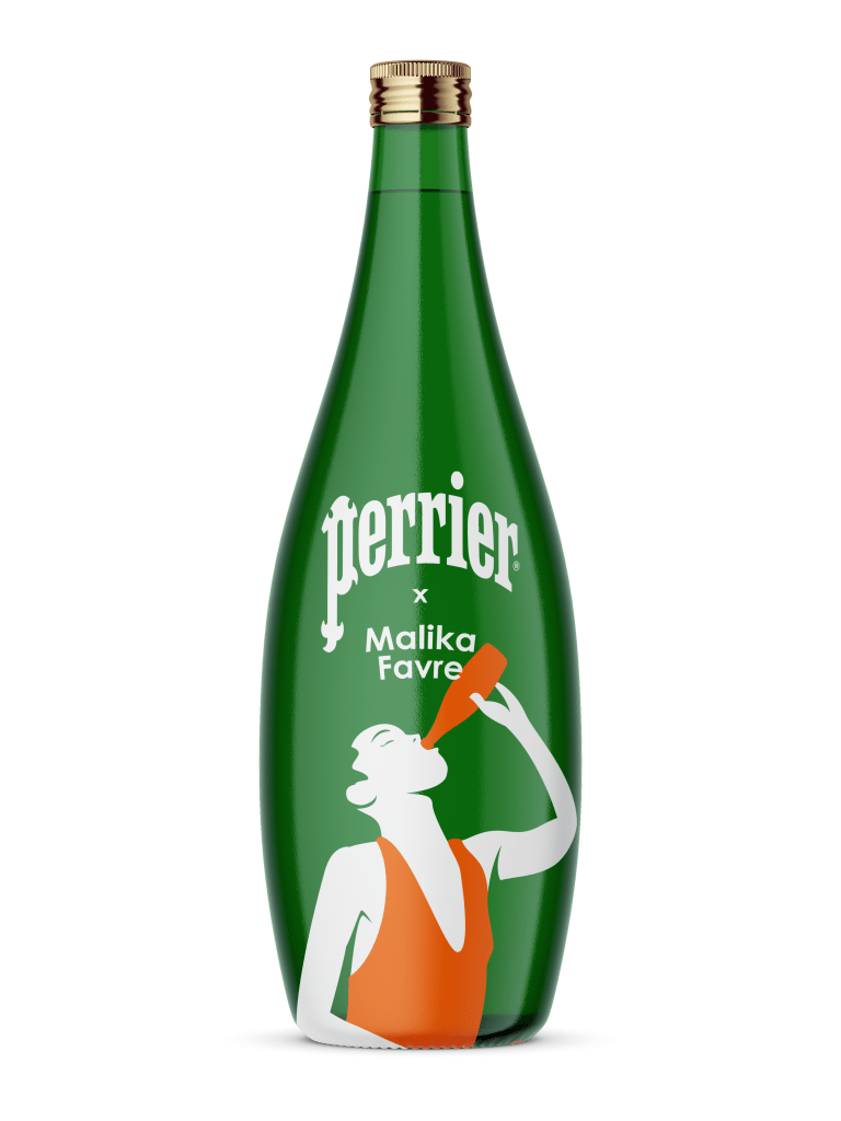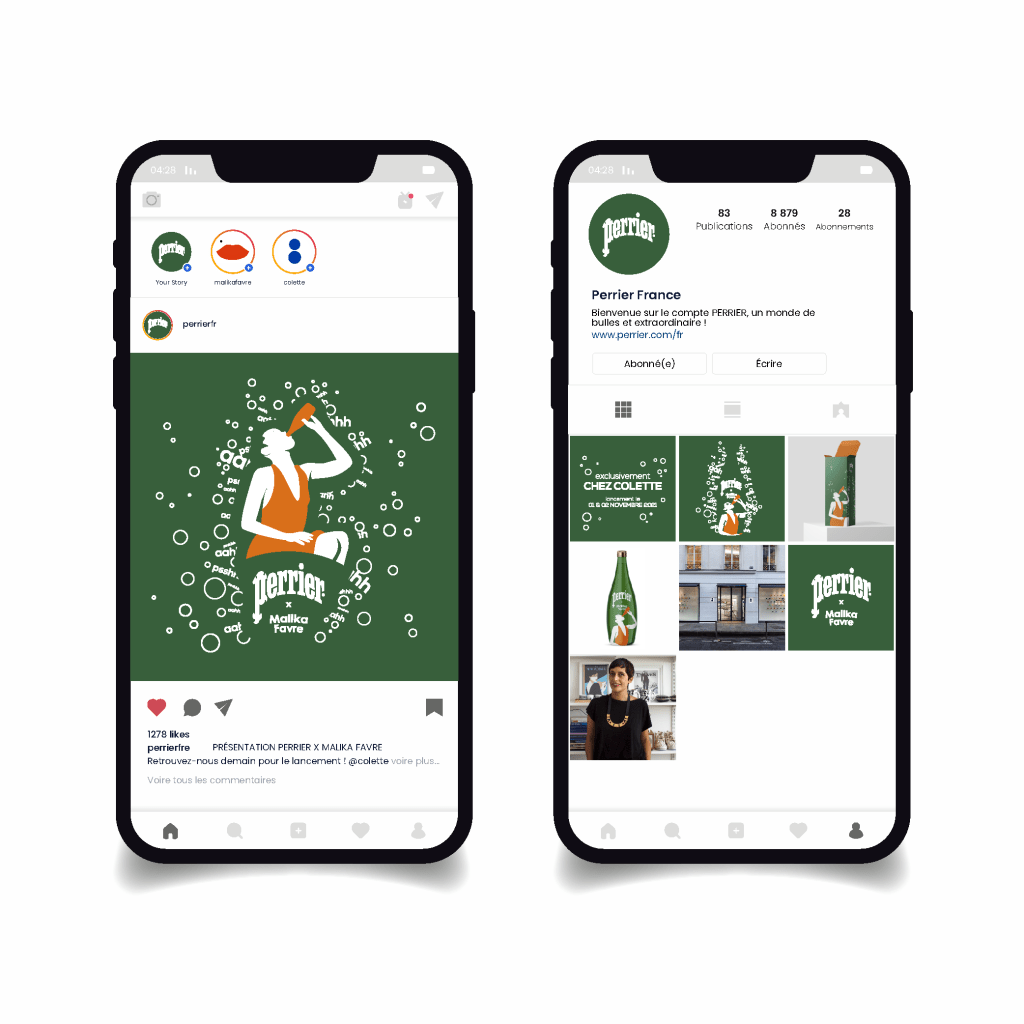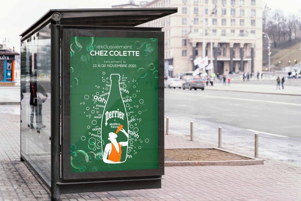 L’objectif de cette co-lab accompagner Perrier dans le lancement de sa nouvelle bouteille. Mais surtout créer un événement autour de la marque avec une édition limitée exclusive, de la nouvelle bouteille Perrier en collaboration avec la célèbre artiste Malika Favre. Le produit serait uniquement disponible dans le concept store « chez Colette » à Paris, tout le magasin est à l’effigie
